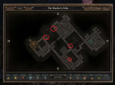 For instance, there are four breakable walls in the Warden's Cellar, marked by the red circles above, that lead to areas off the map with extra chests. Once you know what sort of areas tend to have hidden rooms or unmarked paths, finding them becomes second nature.
